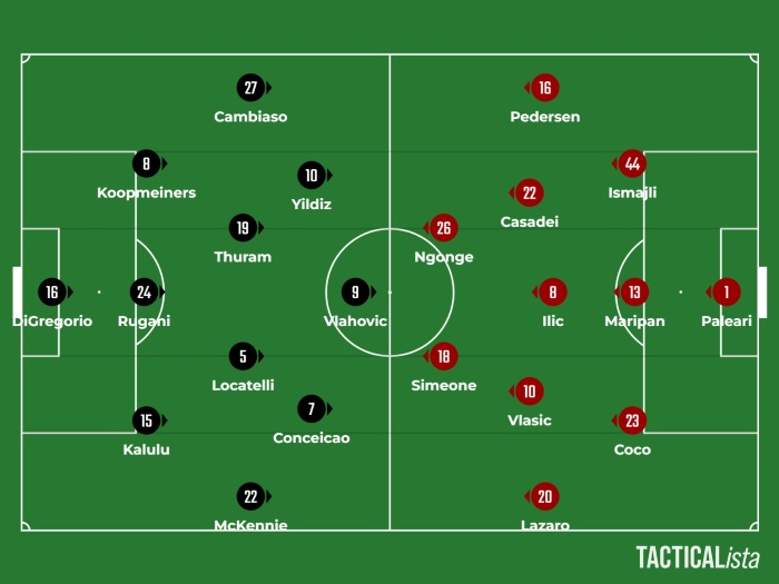 対するトリノのバローニ監督は 3-5-2 を選択。こちらは2トップにシメオネ選手とエンゴンゲ選手を起用するなど予想どおりの布陣でダービー戦を迎えます。