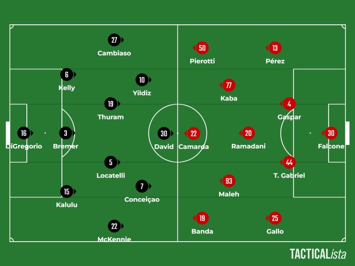 ユベントスのスパレッティ監督は 3-4-2-1 を選択。前線 FW 陣でコンセイソン選手とデイヴィッド選手が先発に復帰した他は前節ピサ戦と同じ9選手がスタメンに名を連ねて試合に臨みます。