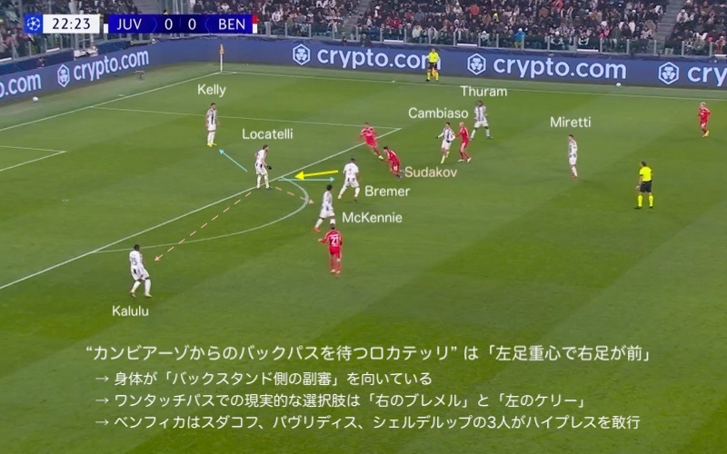 この場面でユベントス「合理性の乏しい(味方を追い越す形になる前後の)ポジションチェンジ」と「パスの受け手の身体の向き」という2つの問題を抱えていました。